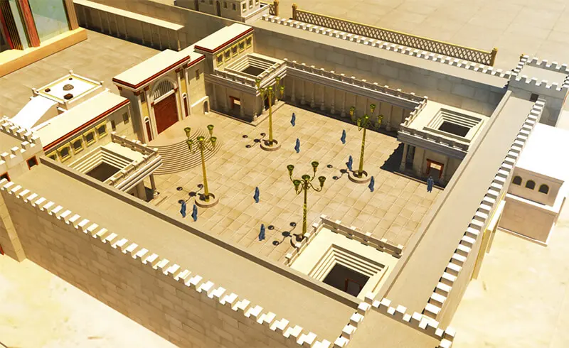 L’une des différences fondamentales entre l’édifice du deuxième Temple et celui du Temple prophétisé par Ye’hezqel, c’est l’emplacement et la structure de la cour. A l’époque du deuxième Temple, le parvis des femmes se trouvait à l’est du parvis du Sanctuaire et lorsqu’on venait de l’est, pour entrer dans le parvis du Sanctuaire, il fallait nécessairement traverser le parvis des femmes. Celui-ci avait essentiellement pour fonction de contenir l’ensemble de la communauté, si bien qu’au début de l’époque du deuxième Temple, quatre salles furent construites sur les côtés du parvis des femmes (sur le modèle des salles du troisième Temple). Le parvis du Sanctuaire dans la vision du Temple d’Ye’hezqel est quant à lui entouré d’une cour, comme cela sera expliqué plus loin. Et c’est cette cour extérieure qui est appelée, dans le commentaire de Rachi, “le parvis des femmes”, conformément au nom qu’elle portait dans le deuxième Temple.
