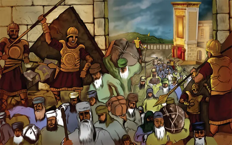 L’exil du premier Temple débuta onze ans avant la destruction du Temple. C’est de cette manière que Rachi conclut les générations de cette époqu(8): Navoukhadnetsar est couronné roi de Babel la quatrième année du règne de Yehoyaqim, roi de Yehouda. Un an plus tard, il prend possession de Jérusalem et à partir de cette date, Yehoyaqim le sert pendant trois ans, puis il se rebelle durant les trois années suivantes. Navoukhadnetsar arrive à Jérusalem suite à la rébellion de Yehoyaqim, il bannit Yehoyaqim et intronise à sa place son fils (Yehoyakhin). Le règne de Yehoyakhin débute la septième année du règne de Navoukhadnetsar. Un an plus tard, la huitième année du règne de Navoukhadnetsar, les Babyloniens exilent le roi Yehoyakhin à Babel. Malgré la soumission de Yehoyakhin, cela ne l’empêche pas d’être quand même destitué. Cet exil est appelé “l’exil des charpentiers et des forgerons” parce que tous les personnages importants sont alors déportés, et, parmi eux, les forgerons, pour empêcher la fabrication d’armes (9). Il ressort des versets que le prophète Ye’hezqel a lui aussi été exilé à Babel pendant cette période. Navoukhadnetsar nomme Tsidqiyahou comme roi. La dix-neuvième année du règne de Navoukhadnetsar, onze ans après l’exil de Yehoyakhin, le Temple est détruit en réponse à la rébellion de Tsidqiyahou. Tsidqiyahou est, lui aussi, déporté à Babel, et ce, après que son fils est assassiné sous ses yeux et après avoir été lui-même rendu aveugle. C’est de cette manière que prend fin la période du premier Temple.